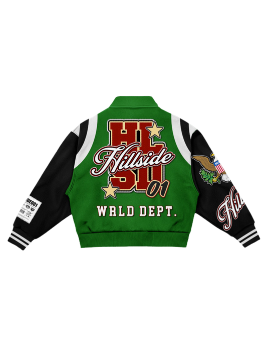 Green “Hillside Wrld Dept” Varsity Jacket