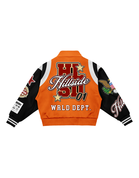 Orange “Hillside Wrld Dept” Varsity Jacket